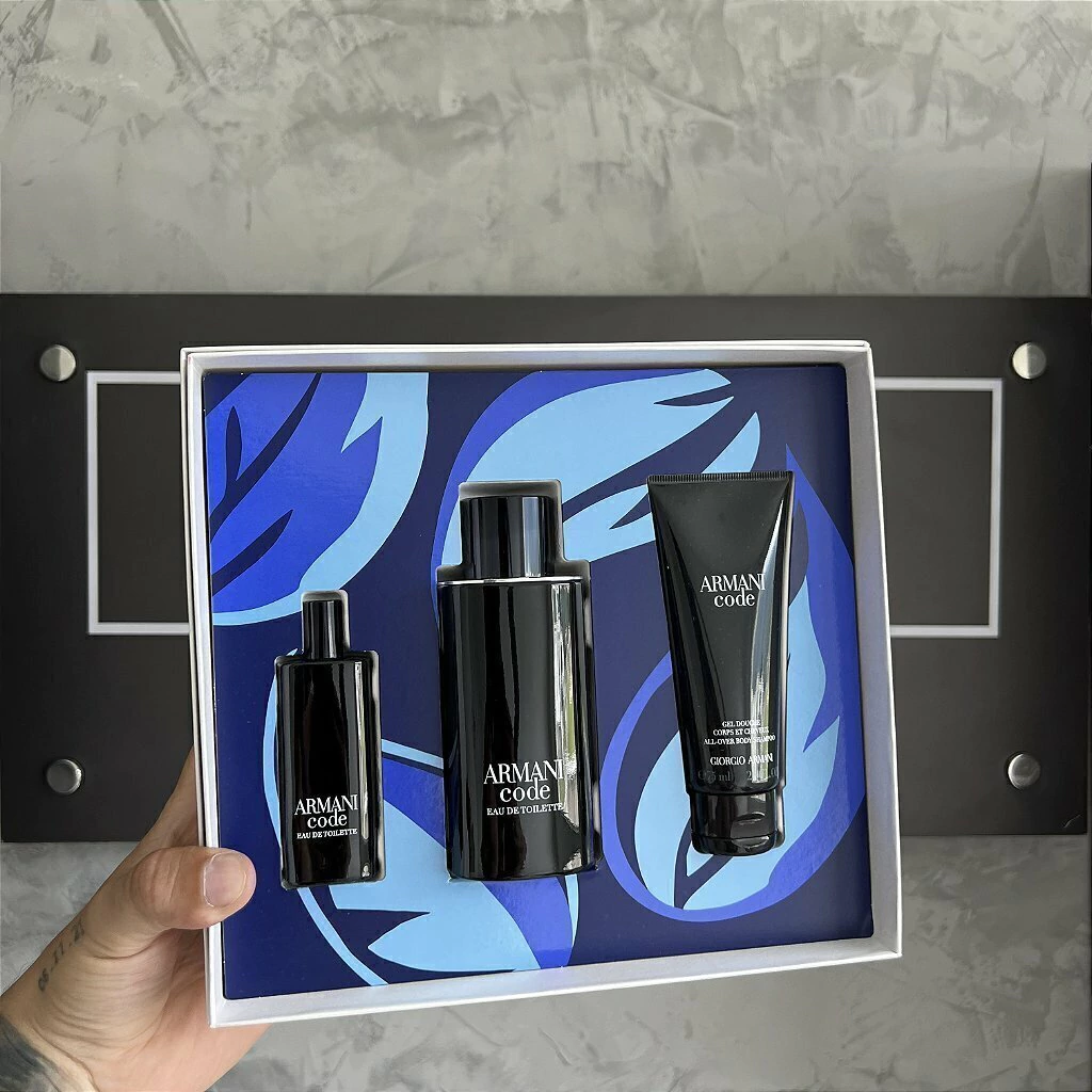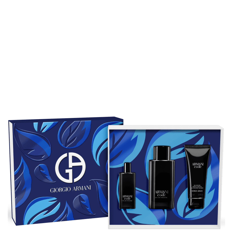 Armani Code Eau de Toilette, em uma linda caixa, que combina a fragrância Armani Code EDT 125ml + a fragrância Armani Code EDT 15ml + gel douche Armani Code 75ml.